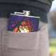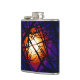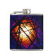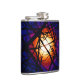 Cette fiole de hip d'art contemporain présente une interprétation abstraite de la lune la nuit à travers les branches d'un arbre, Les couleurs brillantes du spectre blanc, jaune, orange, rouge, marron, rose, pourpre, magenta, bleu et noir donnent l'illusion d'un motif de vitraux moderne.