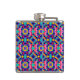 Metallic flask with vibrant geometric pattern in blue, pink, yellow, and purple. Bold design with overlapping shapes on the front and left view.