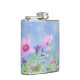 Pretty pink flowers and lavender meadow on a bright spring day against a blue sky.
