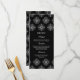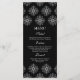 Ce chic menu de cuisine mariage est décoré d'un élégant arrière - plan noir avec un design damassé aux flocons blancs sur le dessus et le bas. Au milieu, vous pouvez facilement customiser ceci avec votre menu.