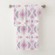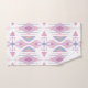Cette serviette de bain dispose d'un motif géométrique tribal de flèches et de diamants en pêche pastel, bleu, rose et framboise sur blanc pour un look boho.