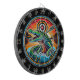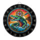 Design circulaire détaillé d'un crocodile dans un lac avec une cible audacieuse et centrée.
