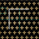 Golden fleur de lis fabric with flowers on black background.