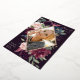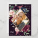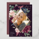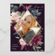 Élégant faire-part de graduation de photo florale présente une photo verticale dans un cadre en forme de diamant de fleurs d'aquarelle et de feuillage dans des tons riches de rose rose poussiéreux, de prune bordeaux violet, de vert sauge, et de bleu foncé poussiéreux avec garniture rose en feuille d'or. Personnalisez avec le nom de votre diplômé, l'année de classe et l'école. Ajoutez un message personnel à l'arrière, ainsi qu'une photo supplémentaire.