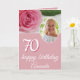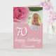 Fleur rose Photo Floral 70e Anniversaire Carte. La carte est rose et a une belle rose rose et une photo dans un cadre rond sur l'avant et sur le côté arrière de la carte. Le texte est dans un script blanc tendance. Ajoutez votre nom, âge, photo et message à l'intérieur.