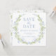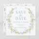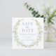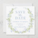 Chic et sophistiqué, cette invitation à la photo Save the Date pour un mariage boho présente un élégant thème botanique rustique avec des fleurs de printemps bleu clair.