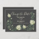 Parfois, les plans changent. Faites connaître à tous vos invités avec ces Changer les cartes de dates avec des fleurs Art nouveau. La carte est dotée d'un script élégant et volumineux qui dit Modifier la date. Le cadre botanique de style Art nouveau, joli et rétro, conviendra à votre mariage extérieur ou à votre événement de fête et plaira à tout amateur de plante de maison. Vous pouvez modifier les noms et toute autre information et ajouter vos propres détails de mariage ou message personnel au verso de la carte.