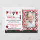 Pneuka-point noir et blanc avec fleurs et bugs dame échange la conception de la carte d'invitation d'anniversaire. Âge 1.