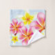 Le somptueux ensemble de serviettes de bain à accent tropical comprend un ensemble de fleurs de plumeria rose et jaune-blanc sur une couleur arrière - plan bleu bébé (personnalisable).