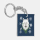 Un loup blanc arctique aux fleurs de neige, le tout dessiné dans un style Art nouveau. Un fond bleu foncé et des flocons de neige tout derrière et autour du loup blanc arctique.