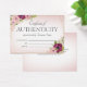 Joli certificat floral d'authenticité avec des lignes géométriques en faux or, et des fleurs en bordeaux et rose roux à laquelle vous pouvez ajouter votre nom ou nom d'entreprise dans un cadre vintage.