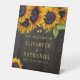 Ferme de campagne rustique personnalisée mariage table de piédestal panneau d'accueil avec de beaux bouquets de tournesols jaune or avec feuillage vert naturel et deux petits coeurs dorés sur un arrière - plan de grange brun foncé. +++++++++++++++++++ Facile à customiser avec les noms de mariée et de mariée, date et lieu. ++++++++++++++++++ Convient pour l'été ou l'automne jardin extérieur ou jardin cérémonies et réceptions mariages.