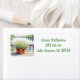 Jolie adresse de retour avec une belle illustration de fleurs blanches dans un pot en cuivre avec une vue arrière sur un lac serein avec pins.