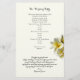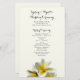 Programme de mariage plat avec fleurs de plumeria jaune. Papier jaune pâle avec des modèles de texte des deux côtés pour une cérémonie mariage traditionnelle. Sur le devant, inclure un titre, une date, le nom du lieu et l'ordre de la cérémonie. Au verso, énumérez la fête de mariage, le célébrant, les parents et les grands-parents, et incluez un paragraphe de remerciements. On peut aussi mentionner ceux qui sont chers et qui sont passés. Ce document est fourni avec des mises à niveau.