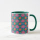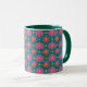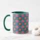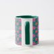 Une jolie tasse à café, avec une lèvre et une poignée de chasseur vert et un motif coloré de Fleurs rouges et roses et Pois jaunes sur un Arrière - plan bleu profond et vert. Faisant partie de la collection Posh & Painterly 'Rangoli', ce motif peut être ajusté pour s'adapter à n'importe quelle Mug de café.