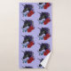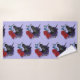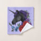 Une licorne noire avec des fleurs rouges, bleues et violettes sur fond de violet clair