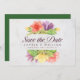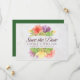 Cette élégante carte de rappel floral présente des fleurs vibrantes avec les mots "save the date" en lettrage tendance, le tout sur un fond en marbre pâle sur le devant et un dos de couleur verte.