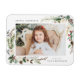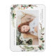 Élégant aimant photo de vacances avec votre photo préférée encadrée de bouquets de fleurs d'ivoire, feuillage vert luxuriant, cônes de pins et baies sèches contre un arrière - plan blanc. Personnalisez les magnets de vacances en ajoutant votre nom et un message d'accueil personnalisé.