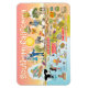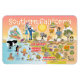 Une scène lumineuse et colorée offre une vue spectaculaire de la Californie du Sud - personnages farfelus sur la plage et le désert de SoCal présentant les parcs de Los Angeles, Orange County, San Diego, Père Noël Barbara, Riverside, Palm Springs, El Centro, Salton Sea, Anza Borrego et Joshua Tree ainsi que les villes frontalières de Tijuana, Tecate et Mexicali. Cette charmante scène a tout - un surfeur pend dix tandis qu'un orque saute de l'eau, des animaux de zoo accueillent les touristes, les amateurs de vin font un toast comme un randonneur est remarqué par un OVNI et bien plus encore...