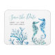 Ce mariage de plage Magnet Réservez la date des hippocampes bleus. Utilisez les champs modèle pour ajouter vos mots personnalisés. Pour voir plus d'invitations et d'idées mariages visitez www.zazzle.com/dotellabelle Art et design uniques de Victoria Grigaliunas de Do Tell A Belle.