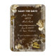 Fond brun rustique avec des roses blanches et des anneaux de mariage en or. Ce joli magnet "save the date" est un moyen élégant et durable d'annoncer votre grand jour. Personnalisez le magnet en modifiant le texte dans les champs fournis. Vous pouvez changer la police, la taille et la couleur.
