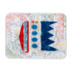 Des formes géométriques audacieuses dominent la composition, avec une forme de couronne bleue au-dessus d'une série de quatre ovales bleus. Une forme rouge zigzaguée ajoute de la vigueur à l'arrière - plan blanc texturé.