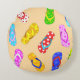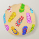 A lovely round throw pillow featuring a bright and colourful pattern featuring cute flip flop sandals! Makes a great home decor addition to a beach house or vacation home.