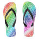 Rainbow stripes run diagonally across the pair of sandals. Overlaid, is a leaded glass pattern created with picture fonts in white.