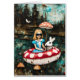 Fantasy collage Alice and the white rabbit on a float trip down a river with mushrooms growing on the banks