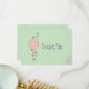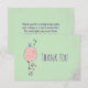 A thank you card with a cute bunny holding a big pink balloon floating up in the air. A little bluebird with little song notes on top of the balloon singing a song. Set on a light green background.