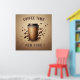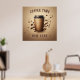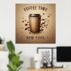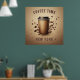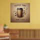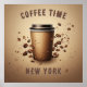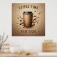 A disposable takeout coffee cup floats at the center, surrounded by rich coffee beans. Warm, cafe-inspired energy evokes morning routines, grab-and-go culture, and cozy beverage moments.