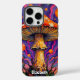 This painting presents a surreal, close-up view of a large, vibrant mushroom against a swirling, psychedelic sky. The artwork is characterized by its heavy impasto texture, with thick, expressive brushstrokes creating a tactile and dreamlike quality. The mushroom has a red-orange cap with white markings and a brightly coloured underside. The background is a dynamic mix of purples, pinks, and oranges, with floating spheres of orange, green, and yellow, along with stylized plant life at the base of the mushroom.