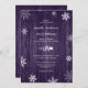 Cette invitation de mariage d'hiver avec des flocons de neige et des cloches de noël sur un arrière - plan en bois de grange est parfaite pour inviter vos invités à votre fête de mariage d'hiver rustique violet.