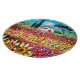 Tuscany landscape,colourful ,vibrant ,expressive beauty of Italian countryside and fields in bright yellow orange,pink,fuchsia,purple,red,green,brown,yellow colours,beautiful Summer flora, ,meadows,flowers,cypress and olive trees,rustic old farm house under the blue sky.Acrylic painting on canvas .