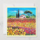 Tuscany landscape,vibrant,expressive beauty of Italian countryside and colourful flower fields in bright yellow orange,pink,fuchsia,purple,red,green,brown colours,beautiful Summer meadows,flowers,cypress and olive trees,rustic old farm house under the blue sky.Acrylic painting on canvas .