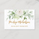 Pretty and chic floral and greenery professional business card features your name in modern gold colour script lettering on a white background and includes a place for your QR code.