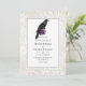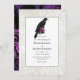 Black and purple gothic wedding invitation featuring a raven decorated with roses and a lace background with a damask harlequin pattern reverse.