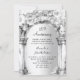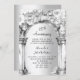 A large marble arch decorated with florals. Personalize and add your party details. A faux silver looking background.