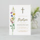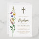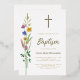 This floral Baptism gold foil invitation features wildflowers and a cross with stylish gold script typography.
