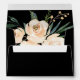 Floral watercolor beige and blush roses on black wedding invitation envelope with return address on back flap.
