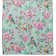 A charming shower curtain featuring colorful songbirds perched among blooming pink flowers and fresh green leaves on a soft mint background. A lovely choice for bird lovers, floral enthusiasts, and anyone who enjoys bright, artistic botanical patterns.