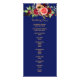 Un programme de mariage élégant et bohème, de style boho. Plumes d'eau, roses, fleurs en rose, violet et bordeaux. Modèles pour vos noms, dates, détails de la cérémonie et de la fête. Devant : arrière - plan blanc, lettres bleu marine.