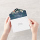 All in one wedding invitation featuring a pretty floral garland, string lights, signature style names and chic typography on a blue rustic wood background. The invitation includes a perforated RSVP card that’s can be individually addressed or left blank for you to handwrite your guest's address details. Designed by Thisisnotme©