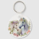 This keychain features a beautiful boho style painting of two white horses decorated with pink and lavender flowers. A matching floral wreath surrounds them. The back has your text in two fields.