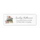 A charming return address shipping label inspired by the “A New Chapter Begins” theme, perfect for a baby shower or bridal shower. On the left side, a watercolor stack of three books in tan, gray, and green hues is accented with delicate wildflowers and greenery in soft blush pink, yellow, blue, and purple, adding a cheerful, storybook-inspired touch.
