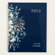 Cette belle planificateur 2022 présente un arrière - plan bleu nuit foncé et un bouquet floral composé de blanc cool, bleu et d'autres couleurs douces. Des fleurs d'aquarelle et des feuilles apportent une touche féminine mais élégante à ce design.