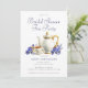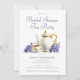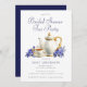 An elegant watercolor floral bridal shower tea party invitation which can be personalized with the inclusion of your bridal shower details. The invitation features an elegant watercolor teapot, cup and saucer surrounded by a beautiful blue floral arrangement. The design is elegant and modern.