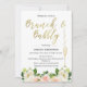 Brunch and bubbly bridal shower invitation with a mostly white and pink floral arrangement at the base and faux gold foil calligraphy heading and champagne glass. The back of the invitation is a pink watercolor wash image. A sweet way to invite guests to a bridal shower.