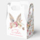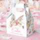 This Easter themed favour box has bunny ears peeking out of a spring flower bouquet with the words "Happy Easter" in pink. You can personalize with a name. The sides have a coordinating floral pattern.