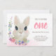 Envoyez ces invitations chouettes à des amis et à la famille pour les invitations à vos enfants une fête d'anniversaire. Ce design est parfait pour les bébés filles 1er anniversaire. Ces invitations au lapin à fleurs sucrées comportent un lapin chéri et une couronne de fleurs à l'aquarelle rose. Personnalisez votre invitation avec les détails de votre événement dans une belle typographie décorative. Parfait pour un anniversaire de printemps ou une invitation de Pâques.